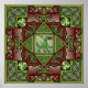 Ein stilisierter Drache sitzt im Zentrum eines Labyrinths aus tiefroter und olivgrüner keltischer Knüpfarbeit. Ist der Drache in der Mitte gefangen oder ist er Meister des Labyrinths?