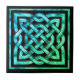 Eine Keramik-Kachel eines blau-grünen keltischen Knotendesigns vor schwarzem Hintergrund.