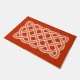 Doormat in einem keltischen, rechteckigen, kontinuierlichen Knoten Muster, symbolisiert die heilige Geometrie und die Verbundenheit des gesamten Lebens im Universum - mittelorangefarbenes Muster, in Weiß umrissen, auf einem tief mandarinorangen Hintergrund