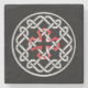 Ein Untersetzer aus Stein mit keltischem Knotendesign mit einem roten Viereckkreuz in der Mitte.