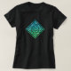 Ein Hemd eines blau-grünen keltischen Knotendesigns vor schwarzem Hintergrund.