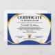 Certificate of Appreciation Blue Gold Elegant Begleitkarte