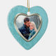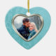 Dieses Urlaubssake-Ornament zeigt Ihr eigenes Foto in einem hübschen, kerulblau-Imitat-Brokat-Muster Rahmen, das einen innen silbernen Rahmen hat. Die andere Seite hat den gleichen himmelblauen, wirbelnden Rand mit zusätzlichem Text auf dem hellgrauen Innenraum. Ein elegantes und festliches Sake-Geschenk für Neuvermählte, Paare oder Porträtfotos. Um Ihr Foto nach dem Hochladen für das beste Erscheinungsbild zu positionieren, verwenden Sie "Anpassen Sie es", die Pfeilanzeigen und mit einem Plus oder Minus das Format. *Bitte beachten Sie, dass das Bild auf der Oberfläche gedruckt ist und kein Brokat oder Metall enthält.*