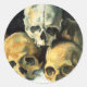 Cezanne Pyramid of Skulls Aufkleber. Ölmalerei auf Leinwand aus dem Jahr 1901. In den letzten Jahren seines Lebens widmete Paul Cezanne verschiedene Stillleben-Gemälde dem Thema Tod und menschliche Eitelkeit. Die Pyramide der Schädel ist wohl sein mächtigstes Schädelgemälde. Die Arbeit besteht aus drei menschlichen Schädeln, die auf einem Tisch platziert sind und ohne Kiefer auf den Betrachter schauen. Ein großartiges Geschenk für Cezanner Fans, Postimpressionismus, Schädelgemälde und französische Kunst.