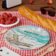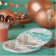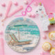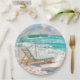 Chaise Lounge auf dem Sand des weißen Ozeans Pappteller