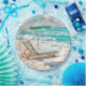 Eine ruhige Strandlandschaft mit gestreiften Liegen und einem Set mit Sonnenschirm vor türkisfarbenen Wellen und flauschigen weißen Wolken