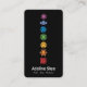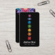Einfaches Design mit den Chakra-Energiepunkten in einer vertikalen Linie auf der Vorderseite der Karte, mit einer farbenfrohen Mandala auf der Rückseite.