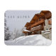 Rechteckiger Foto Magnet eines großen Chalets im Schnee im Skigebiet Espace San Bernardo an der Grenze zwischen Italien und Frankreich im Winter mit dem französischen Text "les Alpes, France".