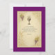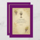 Elegante Einladung zur Erstheiligen Kommunion mit den traditionellen katholischen Symbolen des gesegneten Sacraments: eine strahlende Kalice, die mit "IHS" gekennzeichnet ist, Traubenhaufen und Weizenställe, gerahmt in verzierten Goldrollwerken. Der Text ist Set vor einem Hintergrund im Pergamentstil, der von Violett umrahmt ist, und eignet sich daher hervorragend, um Liebende zu einem heiligen und fröhlichen Anlass einzuladen. Ideal für Jungen und Mädchen, mit vollständig anpassbarem Text für den Anzug Ihrer Familienfeier.