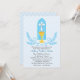 Eine Einladung der Erste Heilige Kommunion enthält ein Kirchenfenster in blauer Farbe mit Kreuz- und Goldkalice, das mit einem blauen Ziegelblatt-Design besticht. Der blaue Hintergrund hat ein blau-weißes kreisförmiges Muster, das sich auf der Rückseite in einem dunkleren Blau wiederholt. (Graphics AMBillustrations ©2017)