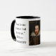 Kaffee-Tasse mit Zitat von William Shakespeares "Zwölfte Nacht": "Es gibt keine Dunkelheit, sondern Ignoranz." Weiß mit schwarzem Interieur und Handgriff und das Cobbe-Portrait, soll ein Gemälde eines jungen Shakespeare sein.