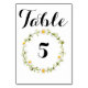 Der Kamillenkranz in Aquarellfarben hat kleine weiße Blume mit gelben Mittelpunkten und grünen Blätter. Tischnummer anpassen