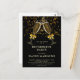 Champagnergläser und Goldbänder mit goldenen Konfetti auf schwarz mit weißer Farbe, Pensionskarte Party Postcard Einladung. Ein trendiger Gold- und Schwarzwurzel mit funkelnden Champagnergläsern. Personalisieren Sie Ihre Party-Informationen. Ideal für Männer oder Frauen.
