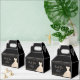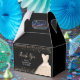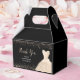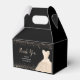 A beautiful champagne white themed elegant watercolor dress gown on a black background with faux glitter at the top and bottom of the favor box.