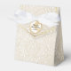 Extravagante Gastgeschenk Hochzeit Geschenkboxen in einem schicken Champagner Fleur Damask Muster, mit einem goldenen Tonstreifen, auf der Frontklappe gemacht. Die Grafiken eines Champagnerfarbenen glänzenden Knopfes, auf der Lasche, haben einen grauen Skripttext, der personalisiert werden kann. Kleine Geschenkboxen für Bonbons und alles, was Sie gewollt haben, um Ihren Gästen zu geben.