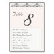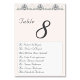 Das Design besticht durch einen Champagner-rosa Hintergrund, der zu Titel und Tischnummer führt. Die Tischnummer wird in einem großen, leicht verständlichen Schriftart angezeigt. Die Namen von acht Gästen werden unten in einem eleganten Nuptial Schriftart auf weißem Hintergrund angezeigt. Konzipiert für die Koordination mit der "Champagne Pink Lace Katholic Wedding Suite".