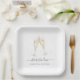 Festliche und elegante Teller für Ihre Verlobungsfeier, Probe Dinner oder Hochzeit mit einer Champagnerbrille in Aquarell, gefüllt mit funkelnden Blasen. Personalisieren Sie sich mit zwei Textzeilen, darunter mit "Beifall zur Liebe" und den Namen des Paares.