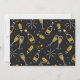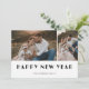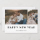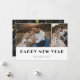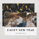 Moderne Schwarz-Gold-Foto-Happy-Silvester-Karte mit zwei Fotos mit einem modernen Schriftart-Typ auf der Vorderseite und einem Neujahrsmuster mit Feuerwerk, Heilige und Beeren, Champagnerflaschen und Gläsern auf der Rückseite. Personalisieren Sie diese Foto-Urlaubskarte einfach mit Ihren Fotos und dem Familiennamen.
