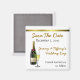 Eleganter Champagner Save the Date Magnet, mit einer Flasche Champagner, einem Champagnerglas und einem goldenen Farbband oben. Passen Sie den Text auf alles an, was Sie gewollt haben, um ihn für Sie persönlich zu machen.