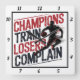 Diese weiße Wanduhr enthält das Wort "CHAMPIONS" oben in einem fett roten Schriftart, gefolgt von "TRAIN USERS" auch in rot, aber etwas kleiner. Darunter wird "COMPLAIN" in einem größeren, mutigeren roten Schriftart angezeigt. Rechts sehen Sie eine Grafik eines Basketballspielers, der schwarz zu sein scheint und einen Ball tropft. Das Design ist sportlich und durchsetzungsstark.