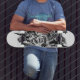 Skateboard-Version der Kunstwerke ''Chaos' Origin'' Bildfiguren und abstrakte Objekte in Schwarz-Weiß. Keine Bedeutung ist es zu suchen, sondern kann in jeder Ecke gefunden werden.
