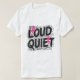 Das "Chaotic Harmony" T - Shirt Design zeigt ein dynamisches Zusammenspiel zwischen den Wörtern 'LOUD' und 'QUIET,'**, die beide in großen, schwarzen, gesprenkelten Buchstaben wiedergegeben werden. Helle, rosa Blitzschrauben schneiden die Wörter durch und unterstreichen die Spannung zwischen Lärm und Stille. Der Hintergrund ist eine chaotische Mischung aus graffiti-ähnlichen Texten in verschiedenen Schriftart und Grautönen, die ein visuell anregendes und zum Nachdenken anregendes Stück schafft.