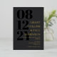 Elegante Typografie Hochzeitseinladung in Holzkohle grau mit Ihrem Hochzeitstag in großen schwarzen Zahlen auf der Seite der Einladung. Fügen Sie Namen und Hochzeitsworte in Goldfolie hinzu. Goldfolie und dunkelgraue Hochzeitseinladung mit Ihren Namen in einem großen Schriftart.