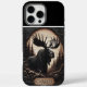 Eine hölzerne Schnitzerei eines Elchs in einem Wald mit dem Namen Charles auf einer Plakette unten.
