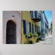 "Charleston, South Carolina" Rainbow Row" von Catherine Sherman. Ein kleiner Hund auf einem Spaziergang genießt die farbenfrohen Häuser in der East Bay Street in Charleston, South Carolina. Dreizehn historische Häuser bilden die Rainbow Row. Die im 18. Jahrhundert erbauten Rainbow Row-Häuser stellen den längsten Haufen georgischer Reihenhäuser in den Vereinigten Staaten dar. Die Häuser liegen nördlich von Tradd St. und südlich von Elliott St. an der East Bay Street: 79 bis 107 East Bay Street Der Name Rainbow Row wurde geprägt, nachdem die Pastellfarben, die sie in den 1930er und 1940er Jahren restauriert haben, geprägt wurden. Es ist eine beliebte Touristenattraktion und ist einer der am meisten fotografierten Teile von Charleston.