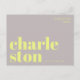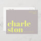 Mit dieser modernen typografischen Postkarte empfängt Sie das Charleston South Carolina mit einem stilvollen und zeitgenössischen Gruß. Dieses minimalistische und auffällige Design mit dem Wort Charleston, das in zwei Zeilen in fett gedruckten, dekorativen Kleinbuchstaben in hellgelber Farbe auf einem weichen grauen Hintergrund unterteilt ist. Die Phrase "Grüße von" erscheint oben in einem schlanken, dünnen Sans Serif Schriftart, das eine moderne, elegante Touch. Perfekt als Reisegepäck, als Dekorationsstück oder als einmalige Möglichkeit, Liebe aus Ihrer Lieblingsstadt zu schicken. Ideal für Fans von zeitgenössischem Design, Typografie und Wanderlust.