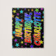 This fun and exciting birthday-themed jigsaw puzzle design feature the message "HAPPY BIRTHDAY, CHARLOTTE" with the characters having a colorful rainbow spectrum inspirred gradient pattern, along with a lively stars background pattern. Das vibrierende Puzzle like this might be hat einen Zug zu Acknowledge the birthday of somebody named Charlotte. [~ Z0000468]