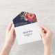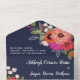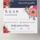 Charmante Blumen in einer Hochzeitseinladung in marineblau mit weißen Schriftart und farbenfrohen Blume in Korallen, Pfirsich, Orange und heiß rosa mit Grün und Beeren. Die andere Seite der Einladung, die als Umschlag dienen wird, ist weiß mit einer anderen schönen Blume unter der Rücksendeadresse.