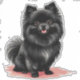 Eine niedliche, flauschige schwarze Pomeranian-Illustration mit leuchtenden Augen und einer rosa Zunge. Der spielerische Welpe sitzt auf einem weichen rosa Schatten, perfekt für Familie, Haustier und Lifestyle-Themen.