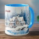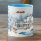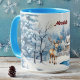 Dieses charmante Design besticht durch ein niedliches Rentier in einem blauen Schal vor einem winterlichen Wunderland mit schneebedeckten Weihnachtsbäumen, einem gemütlichen Festhaus und einem Teich. Der Name Ihres Empfängers erscheint in einem dunkelroten Maron) in der Mitte des Bechers (gegenüber dem Handle und auf beiden Seiten).Geben Sie den gewollt Namen im Bereich Personalisieren ein. Dieses Design wird auf einer Tasse mit himmelblauen - fast türkisfarbenen - Griffen und Tasse im Inneren gezeigt, aber viele andere Optionen sind vorhanden, sowohl schlicht als auch extravagant.