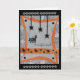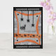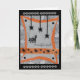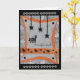 Diese lustige Halloween-Grußkarte wurde digital entworfen und basiert auf einem handgefertigten Original der Gilded Quill. Die Vorderseite zeigt eine Panikkatze, die von schwarzen Spinnen erschreckt wird, die von der Decke herunter tricksen. In der Karte ist der Gruß von "Happy Halloween" enthalten!