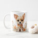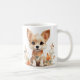 Genießen Sie Ihr Lieblingsgetränk mit dieser bezaubernden Tasse, die mit einem flauschigen Chihuahua geschmückt ist, mit einer perlenartigen Halskette und einem herzförmigen Anhänger. Umgeben von zarten orangefarbenen und beigen Blumenelementen zeichnet sich dieses Design durch die spielerische und liebevolle Natur von Chihuahuas aus. Ideal für Hundefreunde, diese Tasse verleiht Ihrem Morgenkaffee oder Nachmittagstee eine Touch Charme.