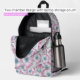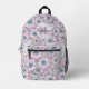 Dieser lebendige Rucksack zeichnet sich durch ein faszinierendes Blumenmuster aus, das die Bühne des Zentrums beherrscht. Das Design präsentiert große rosa Blüten mit zartem blauem und grünem Blattwerk und schafft ein auffälliges und faszinierendes Aussehen. Die klassische Form des Rucksacks umfasst ein geräumiges Hauptfach und eine kleinere Tasche, beide mit Reißverschluss gesichert. Auf der einen Seite befindet sich eine Meshtasche, die sich perfekt zum Stashen einer Wasserflasche oder kleiner Essentials eignet. Was diesen Rucksack auszeichnet, ist die personalisierte Touch: Der obere Bereich erlaubt den Text nach Maß. Momentan zeigt es diesen Namen elegant in kursivem Schriftart, aber die Kunden können diesen Text ganz nach ihren Wünschen anpassen. Egal, ob Sie gewollt haben, Ihren eigenen Namen, ein beliebtes Zitat oder eine spezielle Nachricht hinzuzufügen, diese Funktion macht den Rucksack einzigartig.