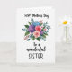 This card features a centered bouquet on a bright white background, arranged like a small celebration in bloom. Large clustered flowers in soft blue and deep lavender sit beside two roses, one coral pink and the other a creamy blush, leaning toward each other with a tender, close-knit feel ❤️. Smaller white and pale pink blossoms fill the gaps, adding a gentle, friendly softness to the arrangement. Teal-toned leaves and thin sprigs stretch outward, while tiny red berries dot the bouquet like little accents of warmth. The lighting is even and calm, keeping the colors softly blended and the edges airy rather than sharp. The message is placed above and below the bouquet in a flowing handwritten-style font, with the words reading “HAPPY Mother’s Day To a wonderful SISTER,” in a dark ink that stands out clearly. The top line sits centered above the flowers, and the lower line rests beneath the stems with generous white space around it 🌼. Blue and lavender petals cluster near the middle, with coral and blush roses slightly forward, and small red berries scattered around the outer edges.
