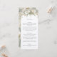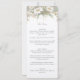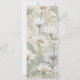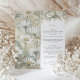 Dieses charmante Hochzeitsmenü besticht durch ein wunderbar illustriertes, wildromantisches Design, das sich perfekt für eine Hochzeit im Freien, im Garten oder bei rustikalen Hochzeiten eignet. Die Vorderseite zeigt ein lebhaftes Bouquet mit weißen Gänseblümchen mit sanft gelben Mittelpunkten, ergänzt durch schlängelgrüne Blätter und Elfenbeinfarben, die alle sorgfältig in einem handbemalten Aquarell-Stil gehalten sind. Die Rückseite des Menüs setzt das Blumenmotiv fort, formt den Text elegant und bietet ein einheitliches Design, das die Gäste durch die kulinarischen Köstlichkeiten Ihres besonderen Tages führt. Die klassische Typografie in einer Kombination aus Serifen und kursiven Schriftart ergänzt die zeitlose und romantische Ästhetik. Dieses Menü dient nicht nur als praktischer Leitfaden für Ihre Gäste, sondern auch als ein schöner Sake, der das Wesen Ihrer Feier einfängt.