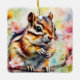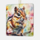 Geräumiger Chipmunk, der auf einem kleinen Zweig mit offenem Mund sitzt. Rosa Blüten treiben in einen Aquarellspülhintergrund. Das gleiche Bild wurde horizontal auf der Rückseite gedreht. KI erzeugt.