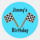 Fun Geburtstagsfeier Aufkleber oder Umschlag Aufkleber in Türkis mit schwarzem Sondertext gemacht. Die Grafik zweier gekreuzter Fahnen schmückt die Mitte. Personalisieren Sie den Text für den besonderen Tag Ihres Sohnes. Großartig mit unseren Jungs Race Auto Birthday Einladungen.