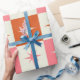Wrap your gift in retro style with this elegant wrapping paper featuring mid century retro atomic starbursts pattern on pink, orange and white checkerboards.