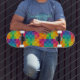 A retro colorful grid pattern. Moving from deep, electric purples and berries into a refreshing center of teal, and finally bursting into sunny yellows and tangerine oranges, this artwork feels like a digital sunrise. The heavy grain texture softens the sharp geometric lines, giving it the authentic feel of a vintage arcade screen or a 80s/90s graphic equalizer. It’s loud, fun, and impossible to ignore. The distinct grid structure provides a sense of order, while the fluid transition of colors from cool indigos to warm citrus tones, keeps the energy dynamic.