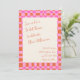 Feiern Sie mit dieser lebendigen Brautdusche im kühlen Retrostil mit einer spielerischen rosa und orangefarbenen Schachbretter-Grenze. Die eigenartige, handgeschriebene Schrift verleiht Persönlichkeit und Wärme, während die asymmetrische Anordnung moderne und unterhaltsame Dinge behalte. Dieses Design eignet sich perfekt für die Liebe Vintager Farben, kühner Farben und nicht traditioneller Ästhetik. Individuell für jeden Namen, Datum und jede Art von Veranstaltung - ideal für Duschen, die auf Zuhause, Party oder kreativen Orten veranstaltet werden.