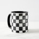 Schwarze u. weiße checkered Tasse mit schwarzem Griff und Kante.