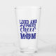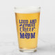 Dieses Bierglas wird mit einem fröhlichen Mama-Druck gezeigt. Passen Sie dieses Objekt an und fügen Sie es hinzu oder kaufen Sie, wie es ist. Lizenzierte Printwerbung
