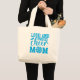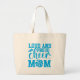 Jumbo Tote Tasche wird in der natürlichen Farbe mit einem fröhlichen Mama-Druck gezeigt. Die Druckfarbe ist türkisblau. Passen Sie diese Tasche an oder kaufen Sie wie gezeigt. Lizenzierte Printwerbung