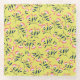 Patterned design with pink flowers and dark green leaves scattered on a bright yellow background. The floral motif is cheerful and lively.