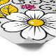 The design contains large white flowers with rounded petals and bright yellow circular centers. Each flower is outlined with thick black lines that give it a clear and bold appearance. The petals include fine black strokes that add simple detailing and texture. The design also includes smaller pink flowers with smooth rounded petals and tiny circular centers. Yellow leaves with visible black vein lines are placed among the flowers, adding contrast and warmth. Flowing black curved lines and decorative swirls connect the floral elements, creating a sense of movement and rhythm. The background is light gray, which enhances the brightness of the white petals, pink blossoms, and yellow leaves. Small star-like sparkles in white are also included, adding a soft decorative touch.