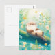 This bright and cheerful postcard features a happy little otter floating contentedly on a moss-covered log. The artwork is rendered in a refreshing watercolor style, highlighting a vibrant palette of mint green, turquoise, and soft yellow. Dainty white and yellow wildflowers sprout from the lush greenery, surrounded by an airy, sun-drenched atmosphere. With its soft textures and playful vibe, this piece captures the essence of a serene summer day by the water. This postcard is a wonderful choice for sending a sunny hello or a note of encouragement to a friend.